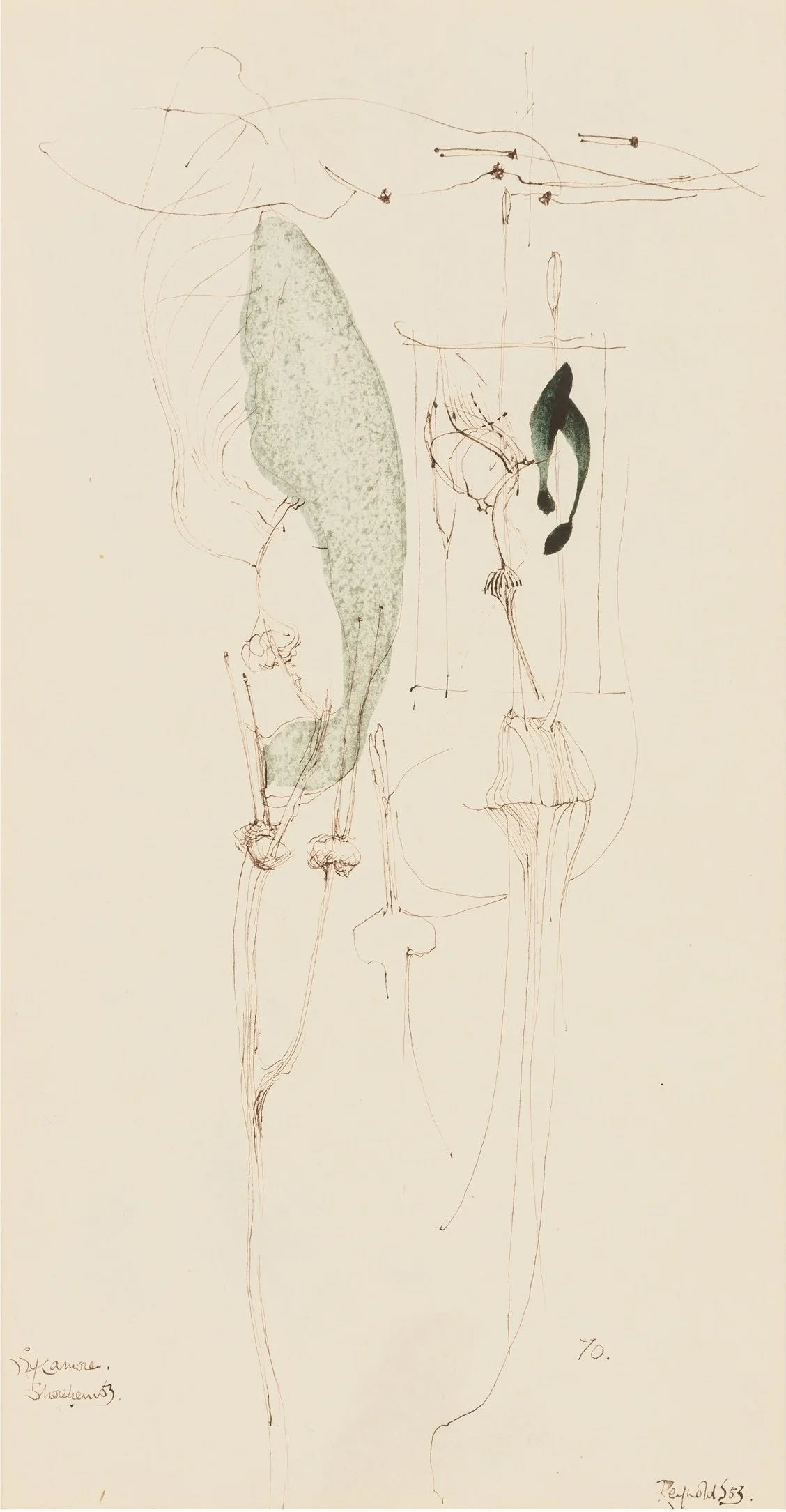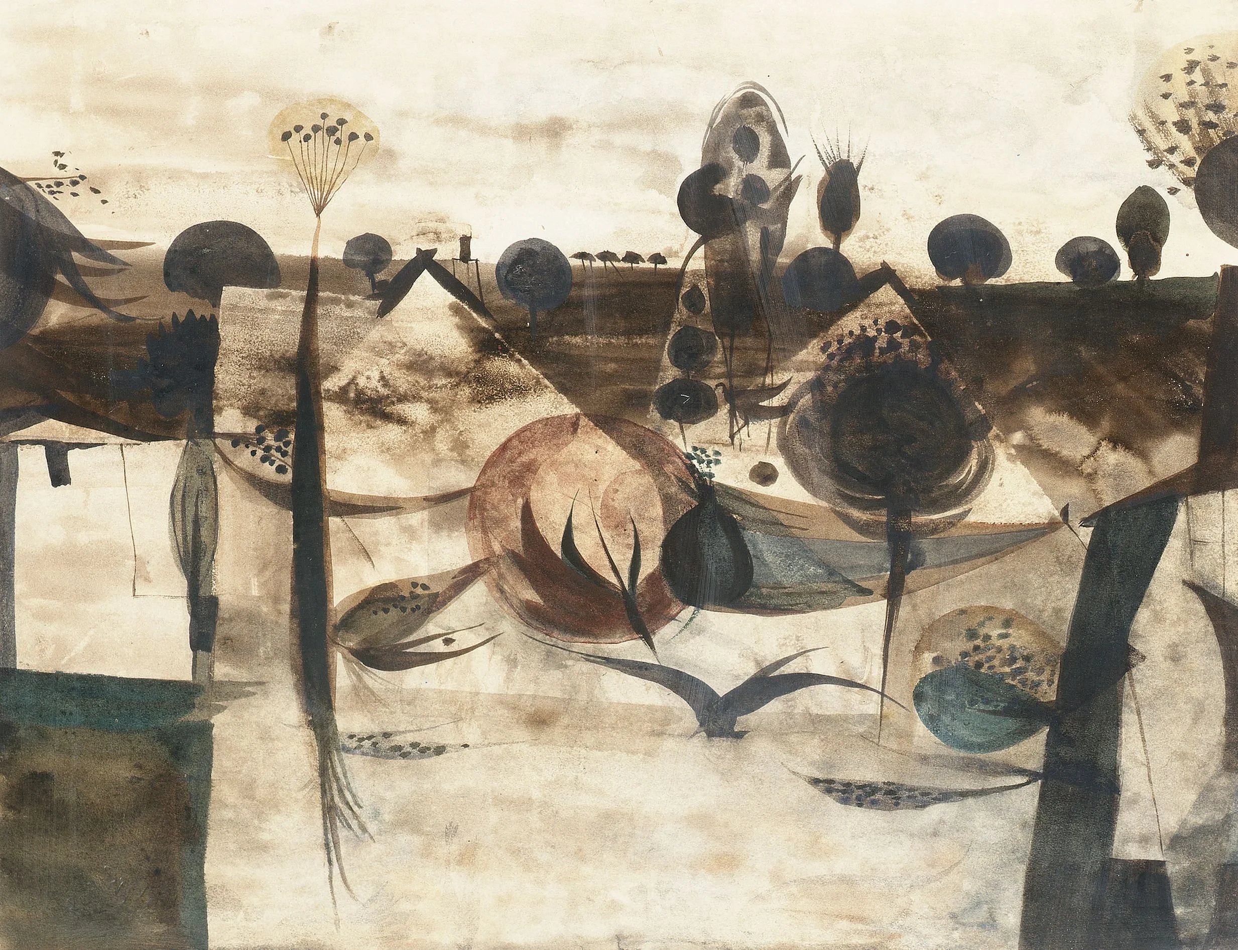 Reynolds established his name in the 1950s with closely observed rural subjects, painted with a strong underlying structure and an early pull towards geometry. He returned repeatedly to orchards, fields and hop gardens, and showed regularly at the Redfern Gallery during the decade.