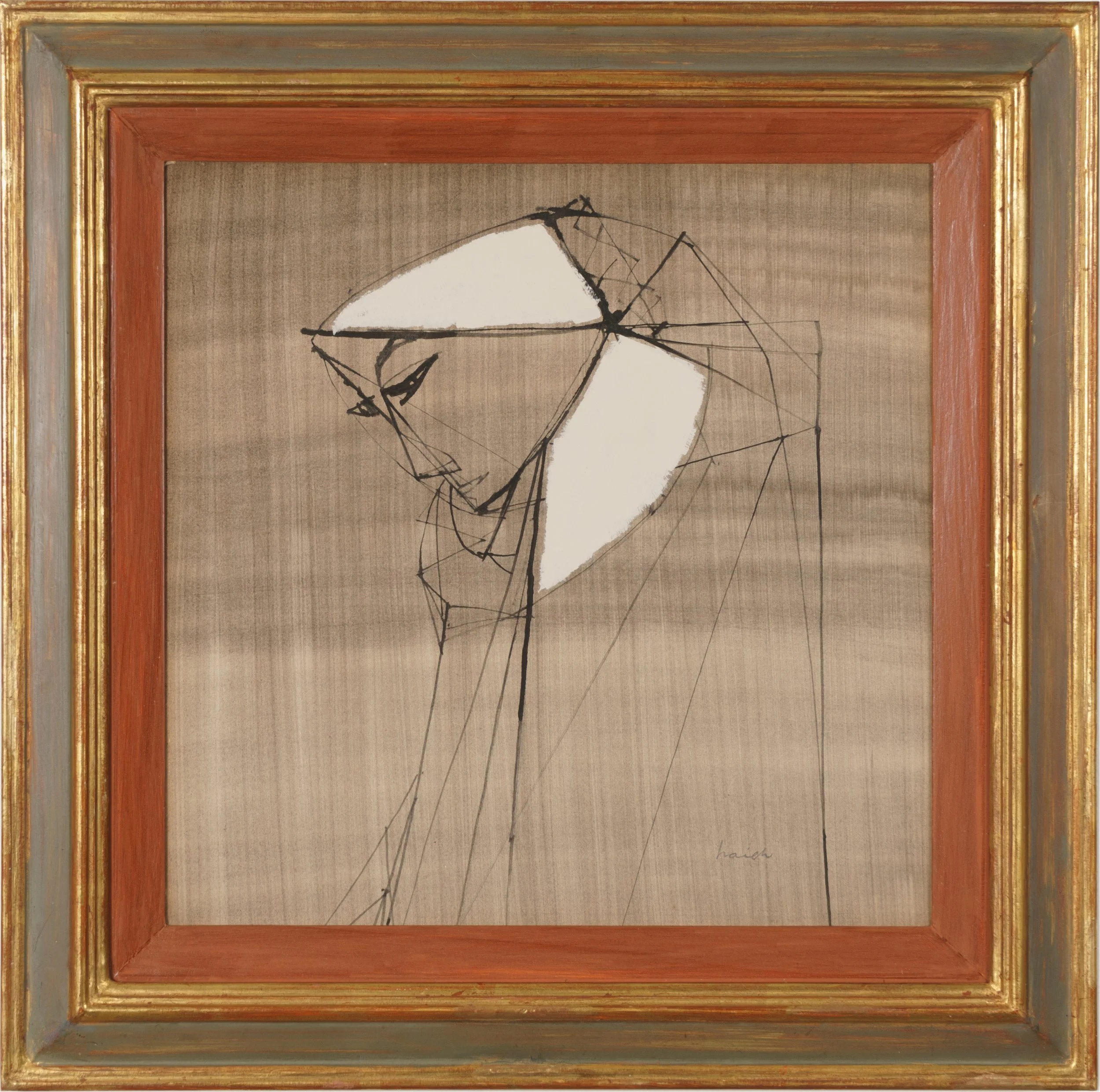 A refined early work by Peter Haigh, in which a stylised female head is constructed from fine, searching lines and angular planes. The restrained palette and geometric structure anticipate the artist’s gradual move toward the muted abstraction that would define his later work. Presented in its original artist-designed frame; the reverse bears an early studio label “1155”, likely indicating November 1955.