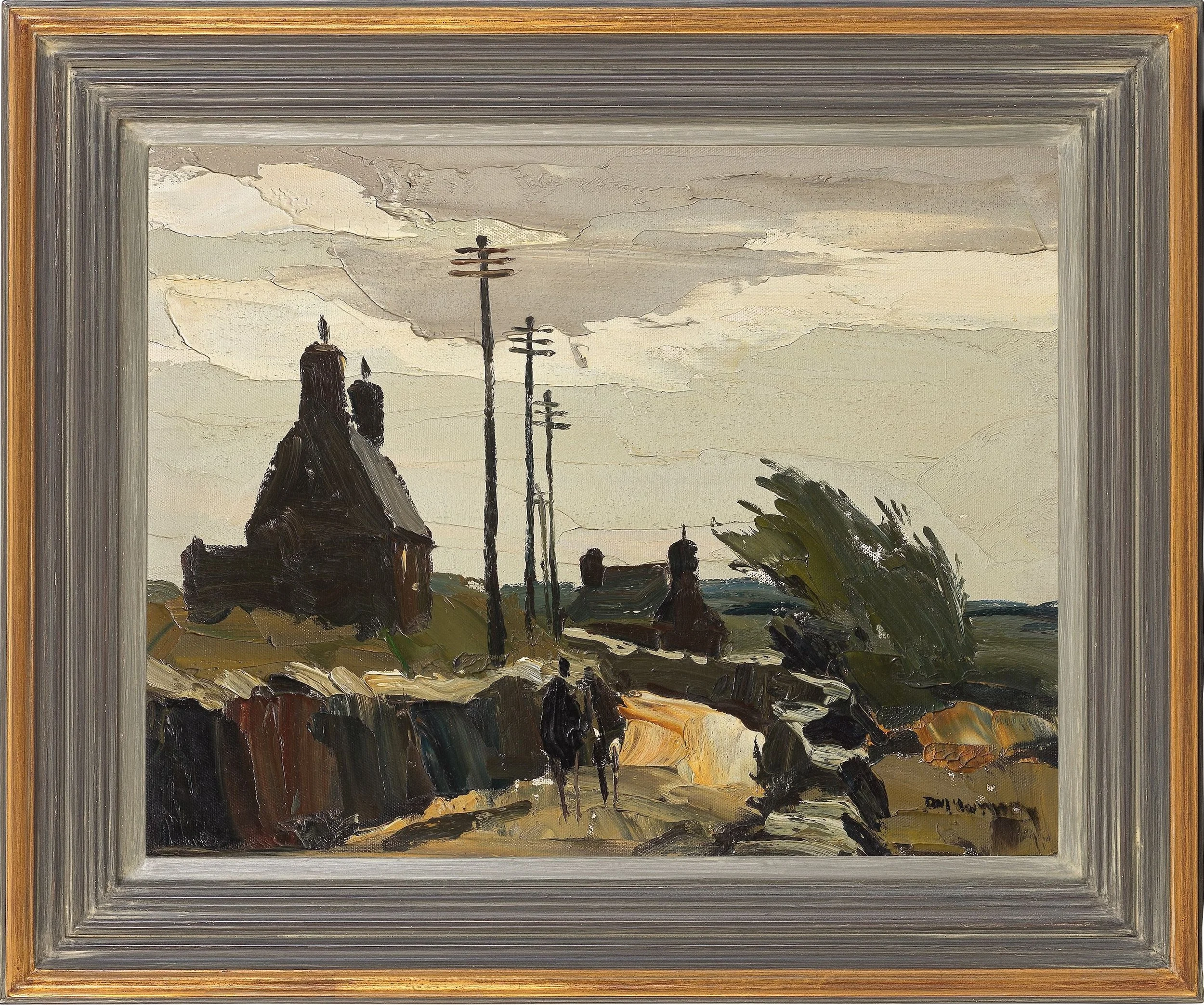 An atmospheric painting of two figures striding along a windswept path. It is characteristic of McIntyre’s early work, which often featured enigmatic figures in the composition and an earthy colour palette. In its original frame, painted in graduated tones.